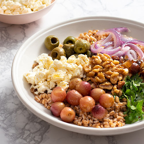 把法老小麦放在碗里。铺上红提、橄榄、洋葱、奶酪、椰枣、核桃和欧芹。淋上橙汁混合物。把剩下的橙汁混合物放在一边搭配食用。4人份餐。